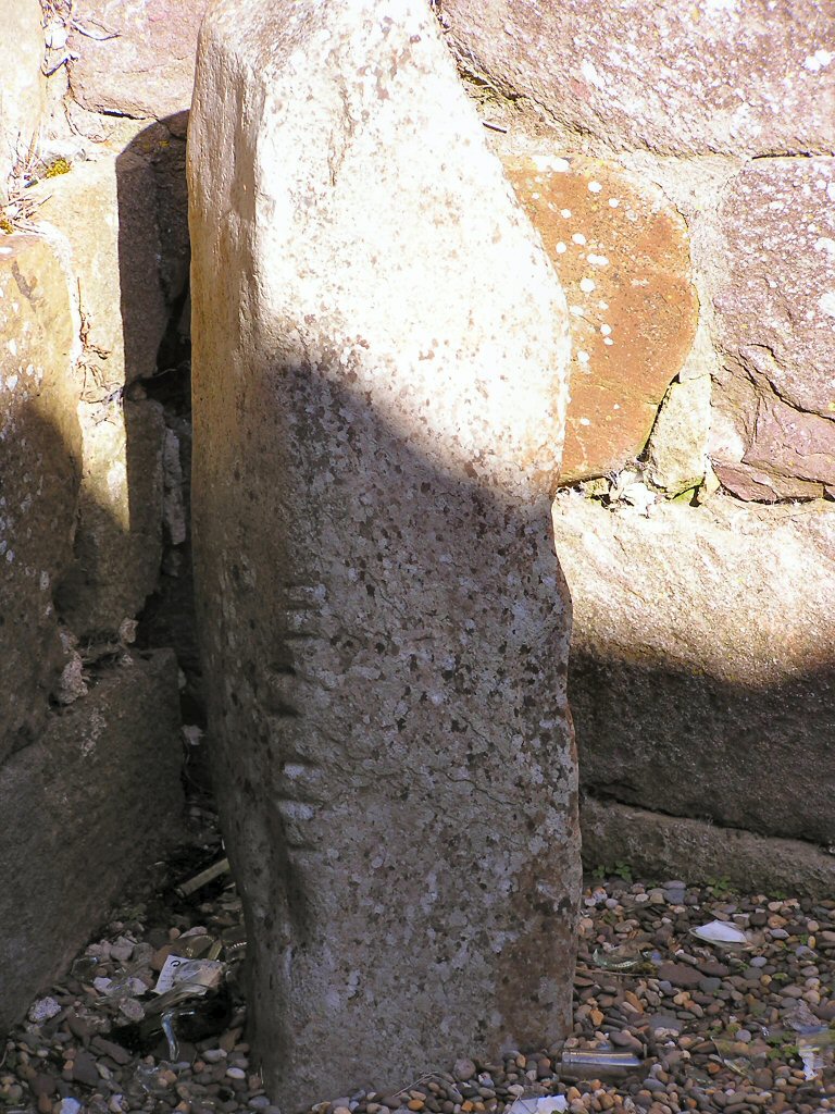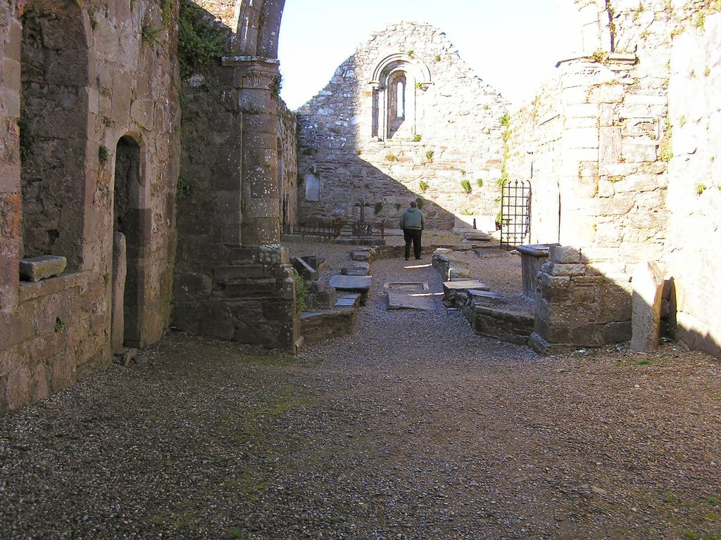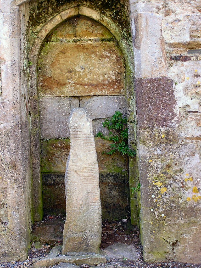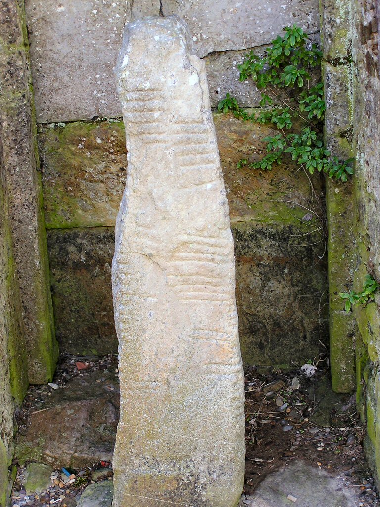Ardmore Ogham Stones, Co. Waterford Ogham Stone AMORE/1 (263) Ogham Stone AMORE/3 (265) Location: In the center of an old monastic site on a hillside to the south of the village of Ardmore, looking out over the bay. About 15 miles southwest of Dungarvan. From Dungarvan, take the N25 southwest approximately 1 7km to the SECOND R673 exit. The Regional road is rough in spots and from the 2nd exit, it is only just over 3 km to Ardmore. The first exit of R673 will take a slightly convoluted route over approx. 8 km of the rougher road to Ardmore. N25 is a very nice road on which to drive. Ardmore Round Tower is quite visible as you drive into the village and the side road to it is posted. Drive past the churchyard up the hill as there are more adequate places to park up there rather than pulling off to the side of the road near the ruined cathedral. The ogham stones are inside the cathedral in this old monastic complex. AMORE/1 - located in an arched niche at ground level in the choir of the cathedral. Dimensions: 4' 2" x 0' 11" x 1' 0" Readings: R.A.S. Macalister -- LUGUDECCASMAQI [MU]COINETASEGAMONAS DOLATIBIGAISGOB - Translation: "Of Dolativix (PN) the smith Lugud's (PN) son, tribesman of Nia Segamain." Comments: Macalister/1945, 258, notes that the stone carries two distinct inscriptions, `the first, on two angles, (up-down), pocked; the second, on a third angle, chiselled'. Macalister/1945, 259--260: `BIGAISGOB = uici episcopus...(rural or assistant bishop). This Ogham, therefore, intruded on the earlier inscription, is of Christian character'. AMORE/3 - located in a NW corner formed by the cathedral wall and a column directly across from AMORE/1 Dimensions: 4' 4.5" x 1' 1" x 0' 9" Readings: R.A.S. Macalister -- AMADU Translation: (this inscription was intended as a name only) a male form of the Latin word for "Beloved" Comments: Along the angled top is a simple carved cross on the opposite side of the stone from the ogham inscription.History: Macalister/1945, 260: discovered by the late Mr. R. Chearnley of Salterbridge on a low wall beside a grave in the cemetery. Other Items of Interest: Ardmore Church, Ardmore Round Tower |