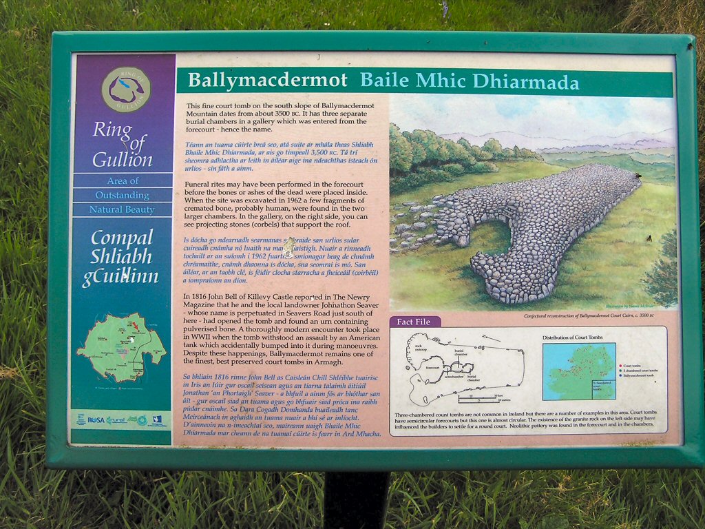 History: Ballymacdermot Cairn (circa 3500 B.C.) has been investigated at various times in its history. In the nineteenth century
